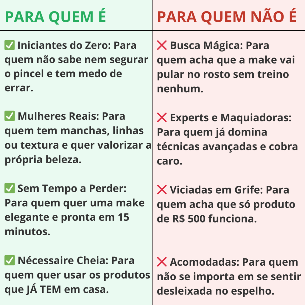 Esse produto é um treinamento composto por 4 módulos, divididos em 14 aulas que irão te ensinar o passo-a-passo para uma maquiagem de excelência para qualquer ocasião em 2026.